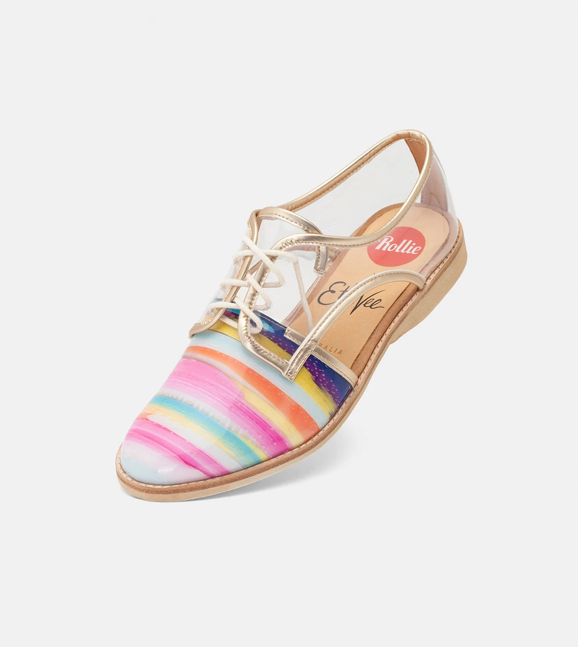 The Sidecut Paris, with the name inspired by the city she resides, it emulates the beauty of her glass art work with a clear, breathable TPU upper and pastel hues painted onto the front canvas, creating an array of wonder. The gold piping on the shoe mirrors that of the brass frames that outline her glass works, finished with a gold chain on the heel!