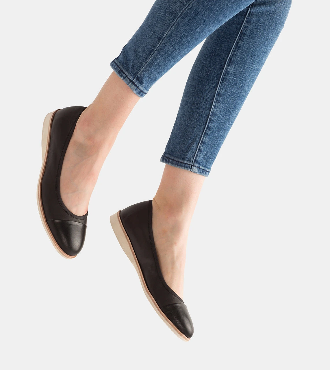 Look no further, we have a Ballet flat! This all black leather ballet with a black toe cap detail is perfect for work or play.