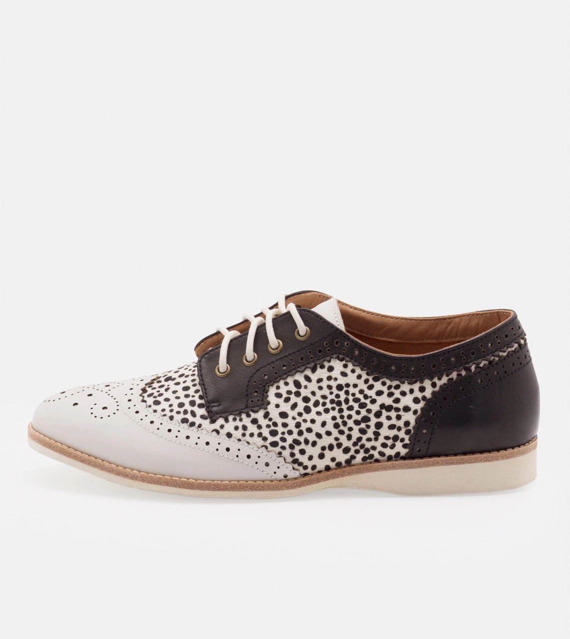 Bringing back the brogue with a few of our favourite things, contrast white and black leather and our snow leopard pony print. This combination is super sleek and fun for your winter style this season. With beautiful leather uppers, memory foam socks and a ballerina instep elastic, you’ll be bragging about how comfortable and cool your shoes are to everyone. This brogue sports our third generation outsole bringing it back to our clean look aesthetic with the added grip.