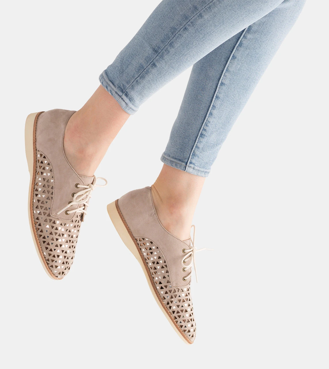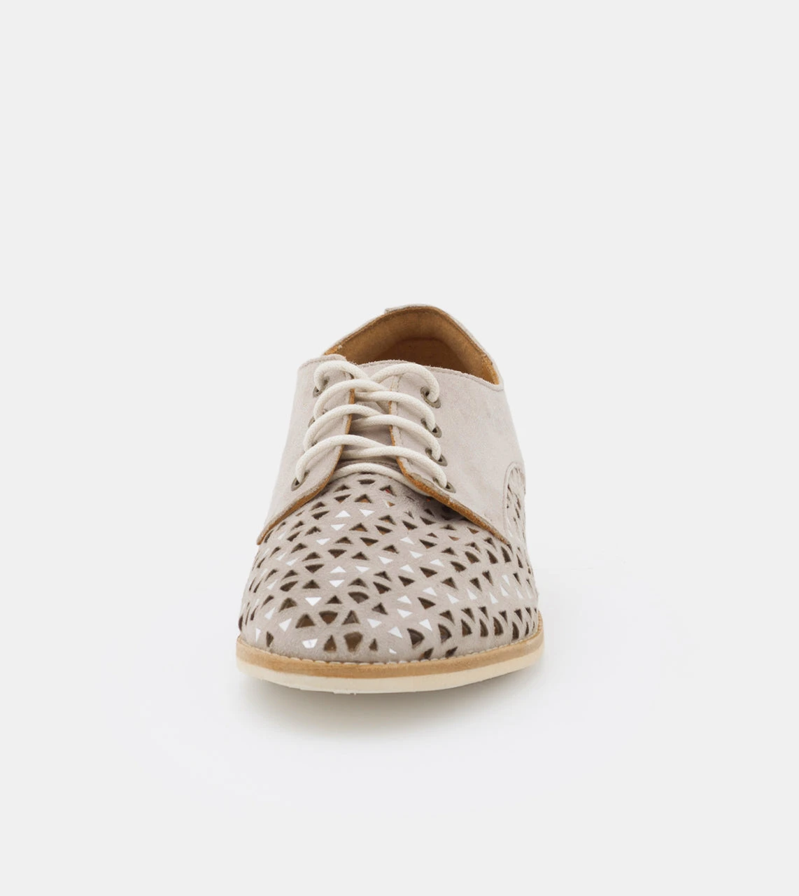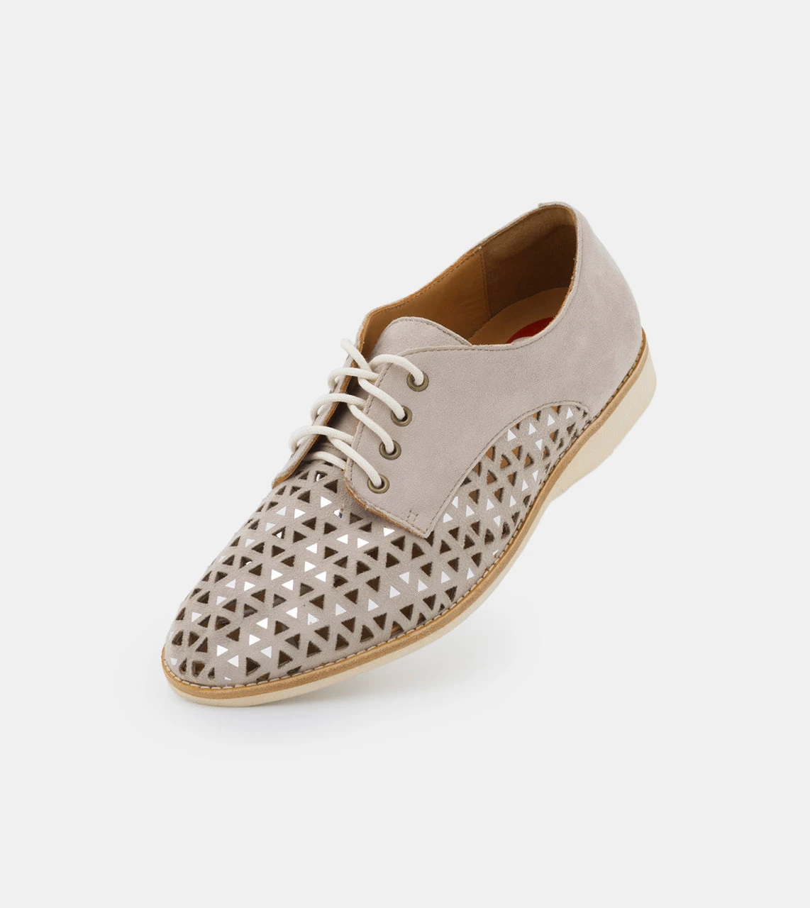 Need to reflect and relax this summer? Why not let our new Rollie Derby Triangle Punch Light Taupe Suede do just that for you! With a unique triangle punch cut outs with combined with silver triangle reflectors to get you shining with every step you take. This super soft light taupe suede is inspired by mother nature and the hues of the earth.Â