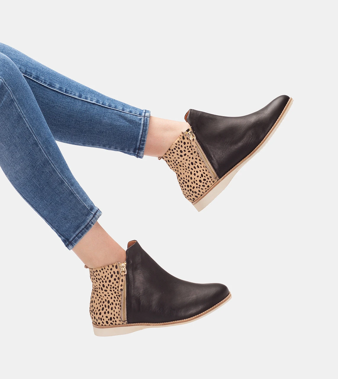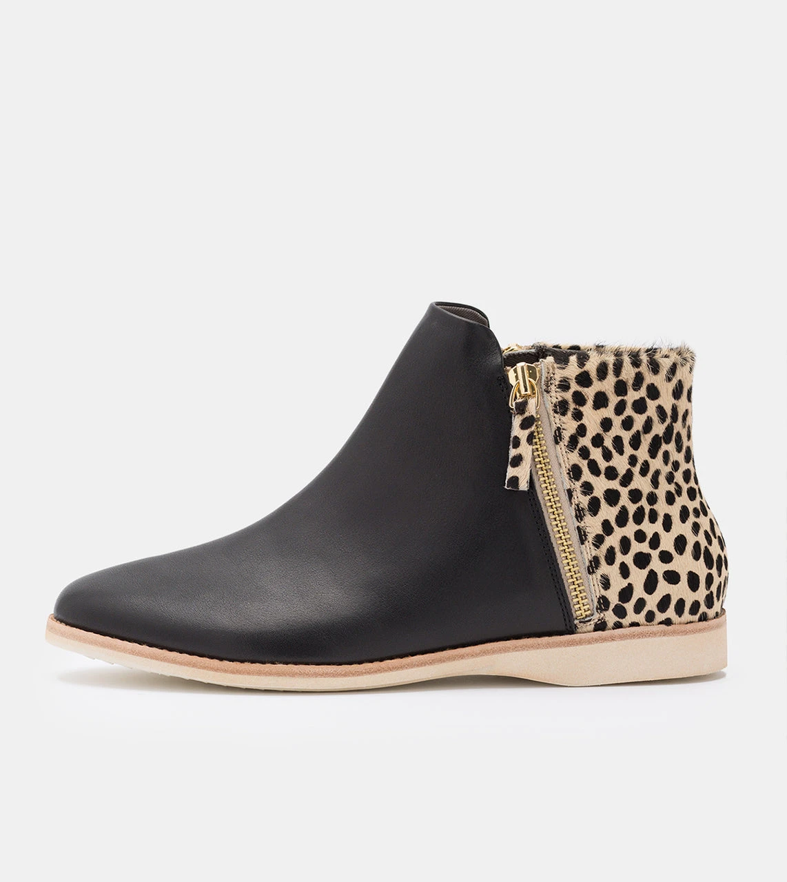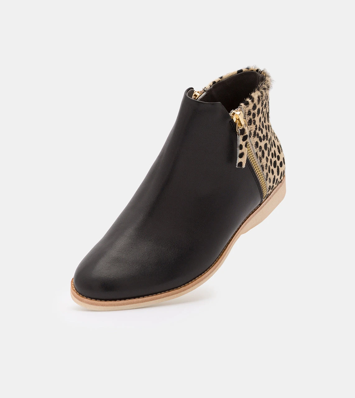 Let out your animal instincts with this funky winter essential. Gorgeous black leather with a cheeky cheetah pony hair finish. Memory foam socks and canvas lining make them uber-comfy. Part practical. Part fun. The way we should all be. For when life calls for something above the ankle. Boot fit. Sneaker comfort.