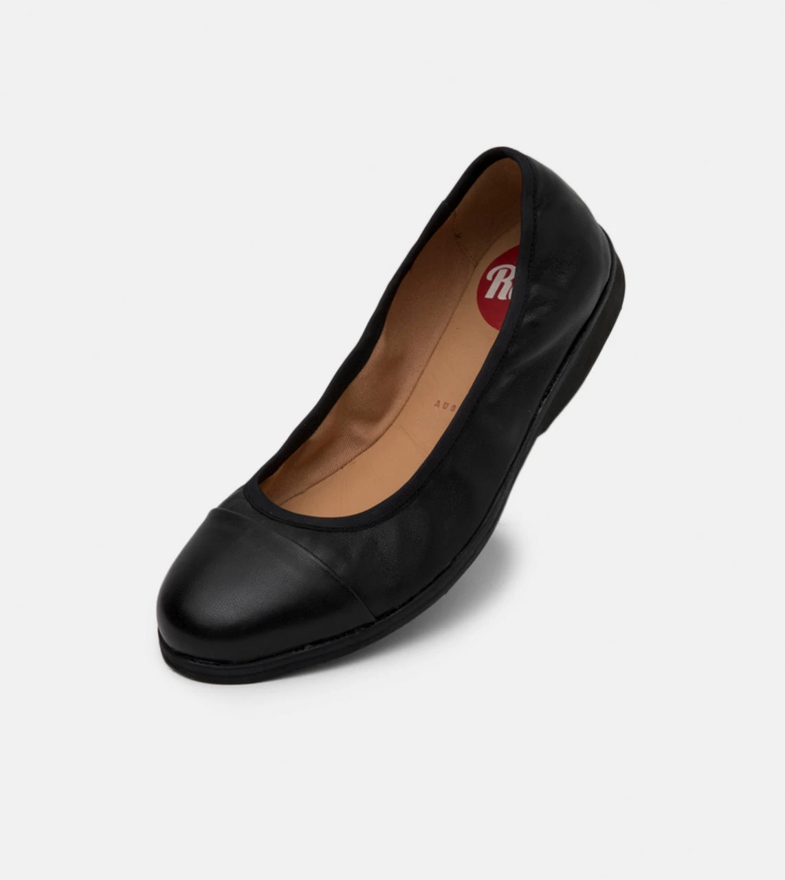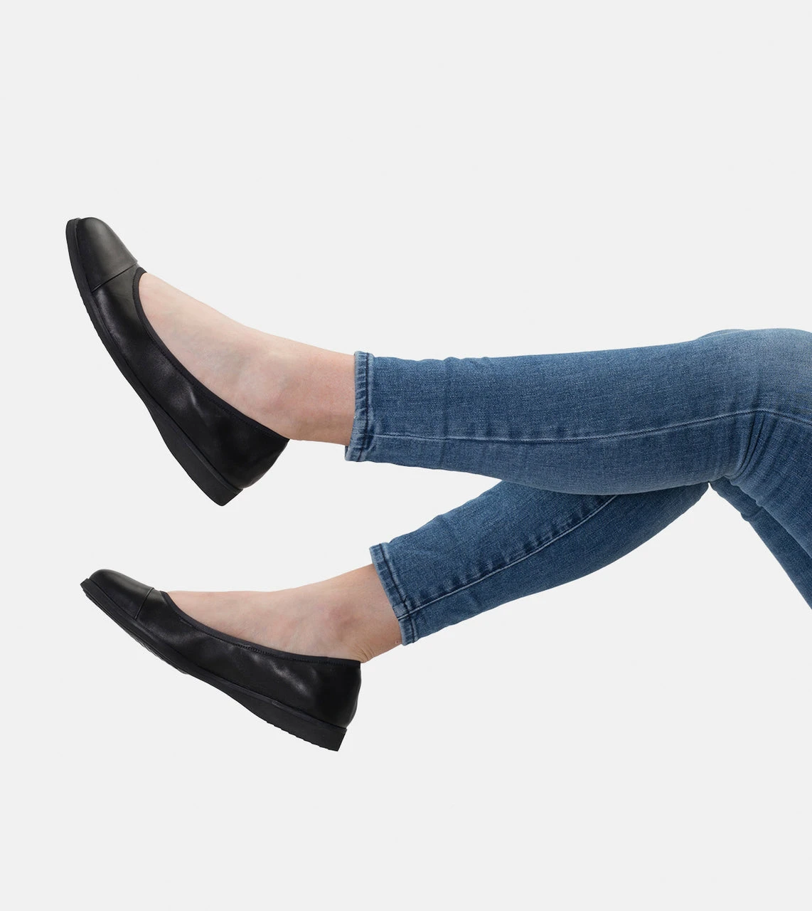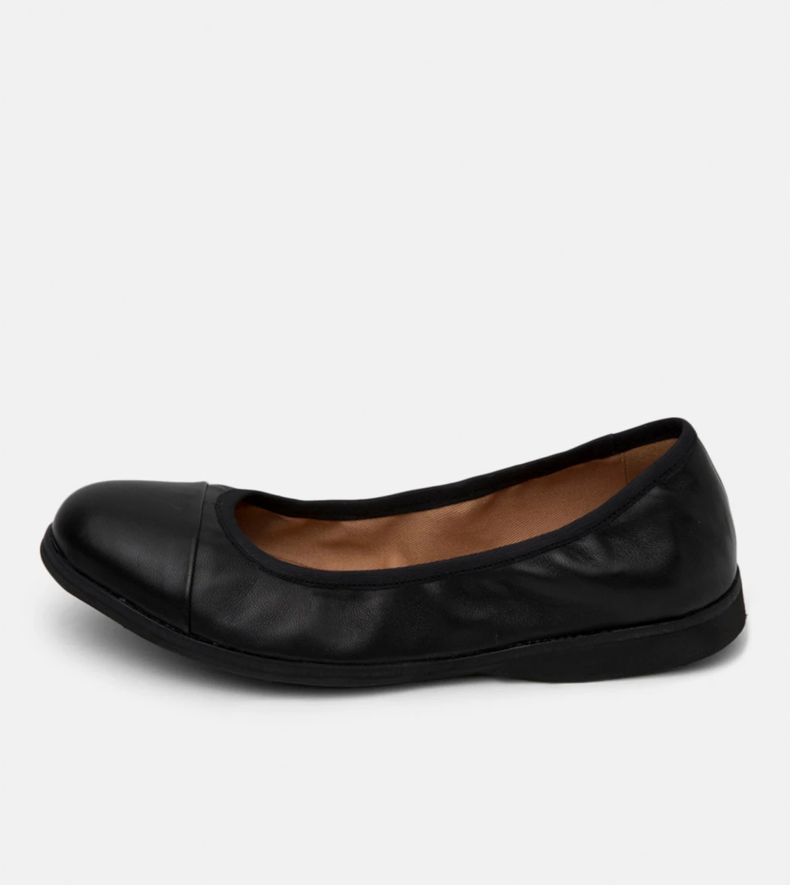 Look no further, we have a Ballet flat! This all black leather ballet with a black toe cap and black outsole is a classic and perfect for work and play!