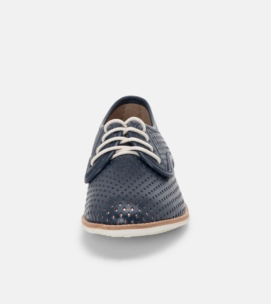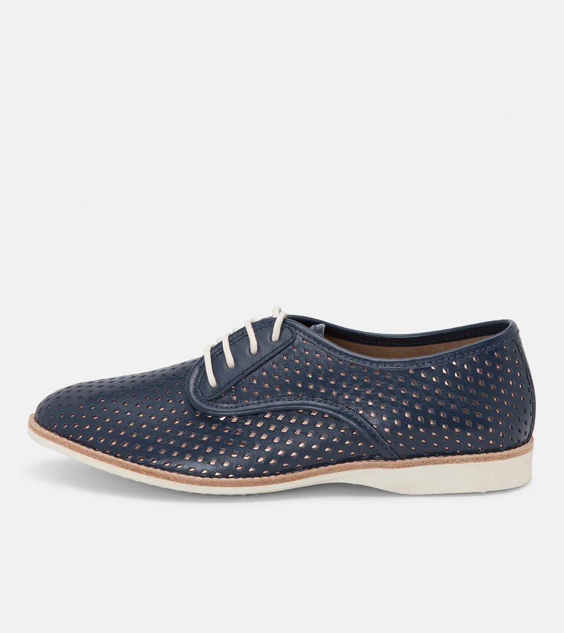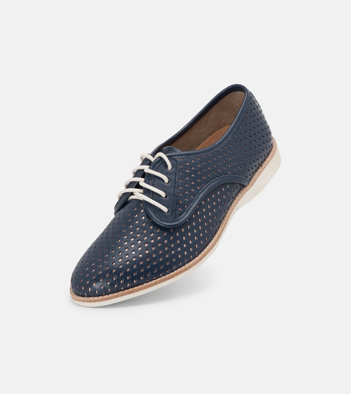 A shoe with a heart of gold. Literally. Navy punch leather upper with shimmering rose gold underneath, like a just discovered bounty of treasure. Luxurious leather and memory foam insoles for soft touch comfort. Versatile enough for work or play. Who says navy shoes have to be plain? Make any outfit sparkle (oh, there we go being literal again).