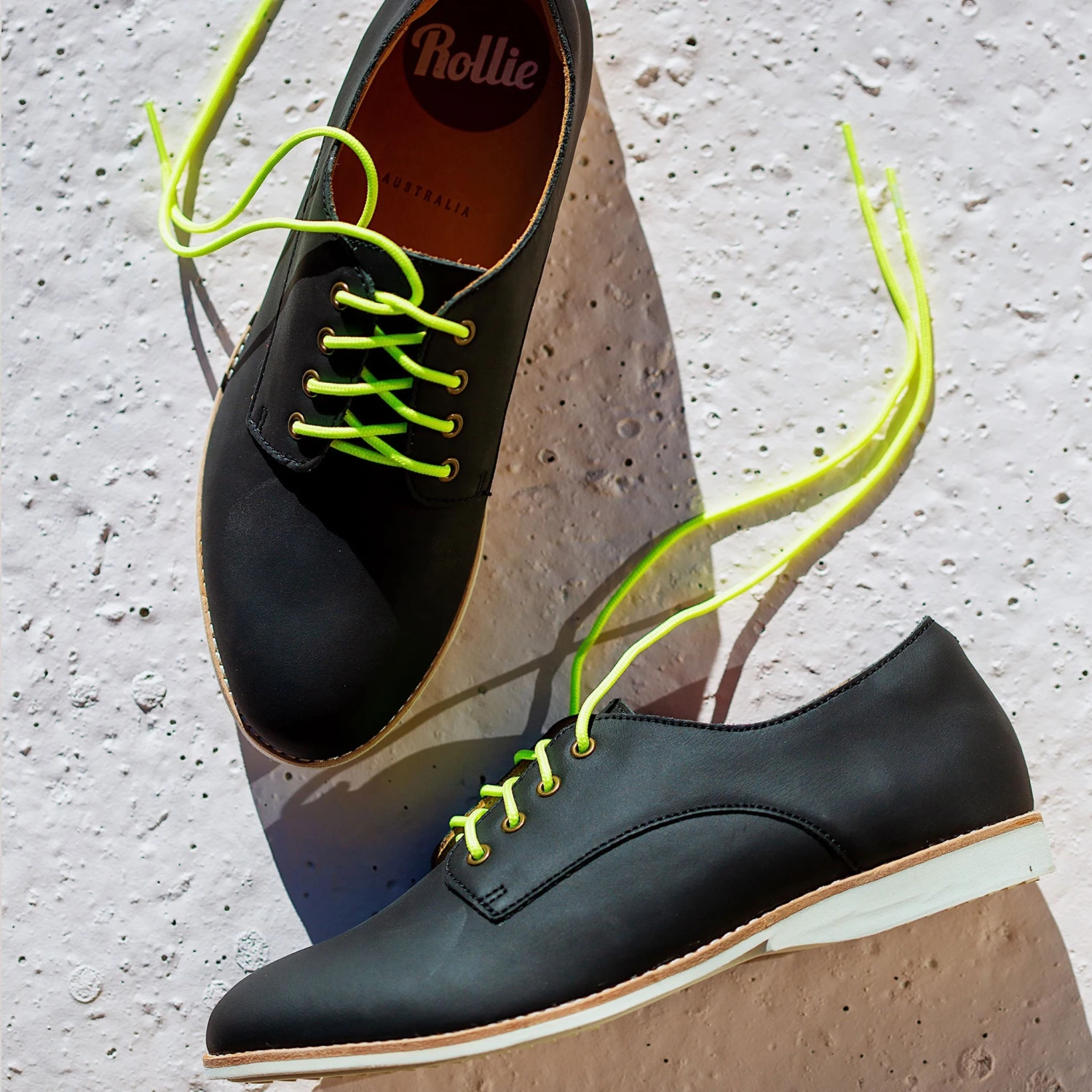 The classic black Derby with a cool rubberised finish gives this shoe a little edge, and also protects your feet on those wet dewy mornings. Like all Rollie shoes, the Derby is comfy and light, the perfect shoe for all day wear.