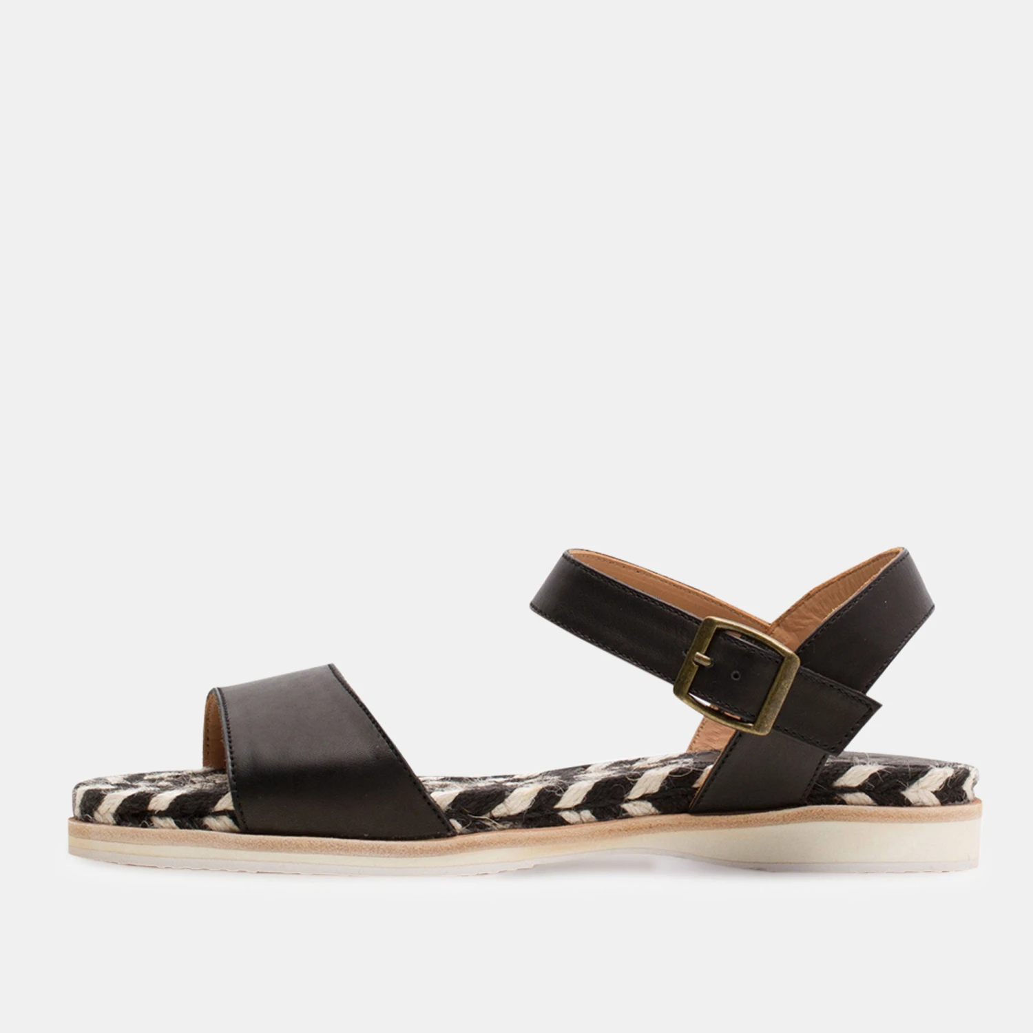 - Soft black leather upper with a side buckle for fastening.