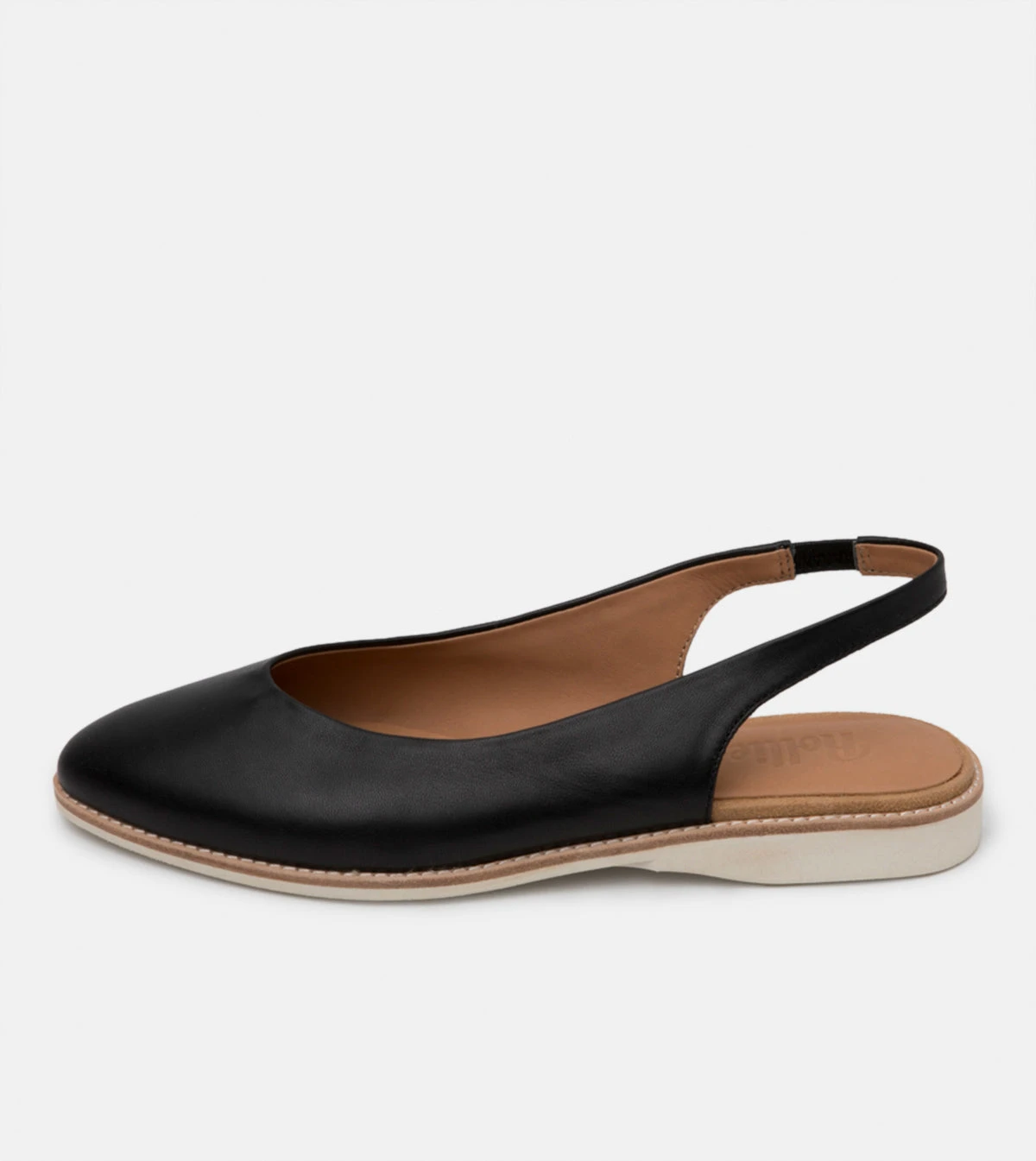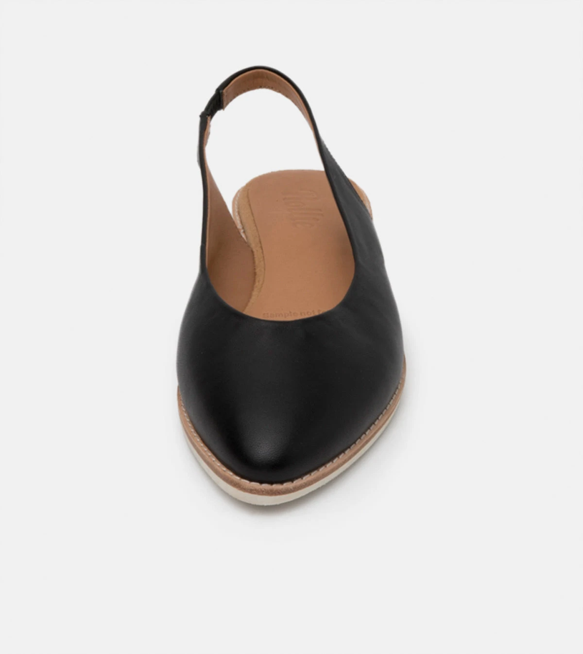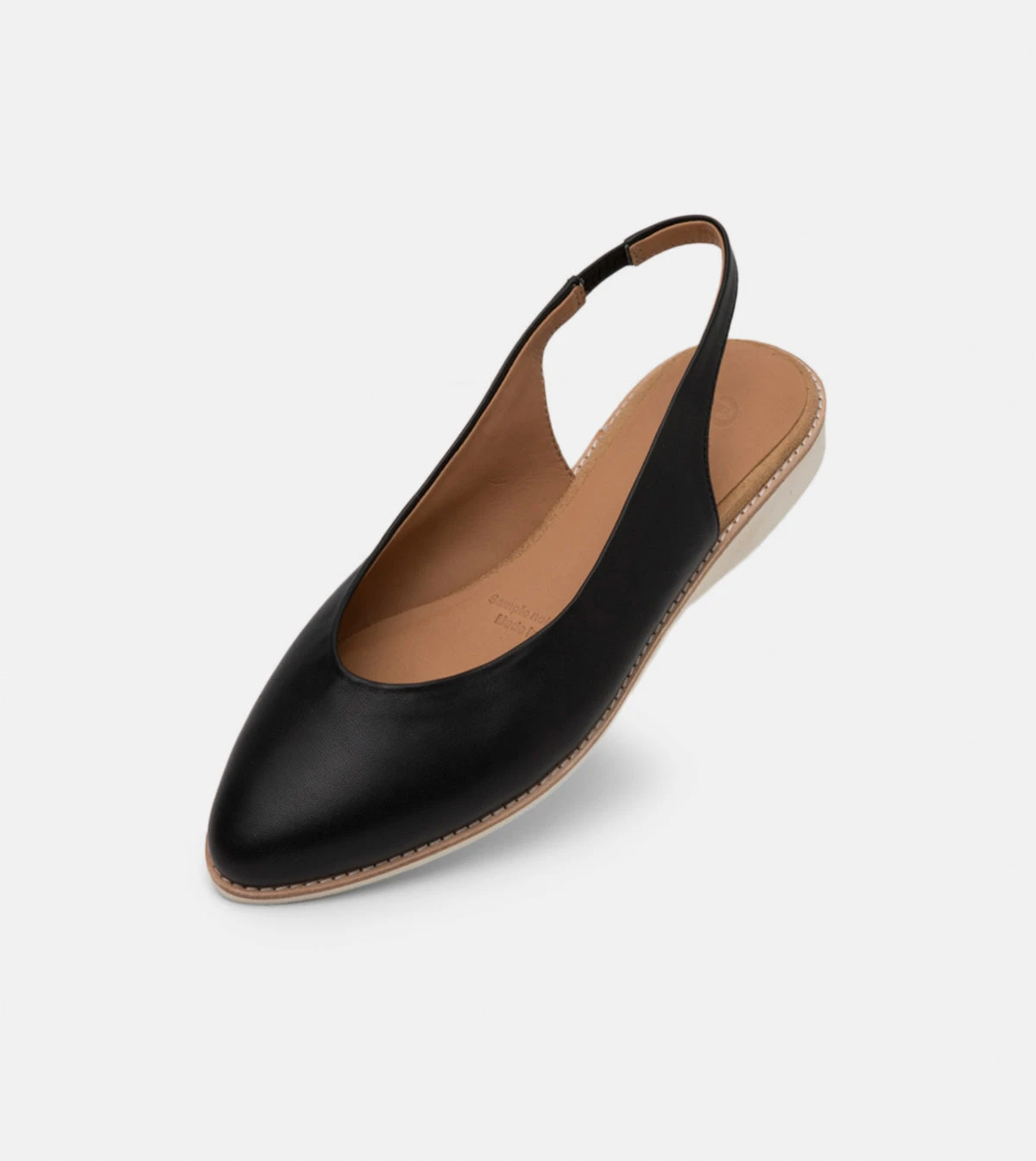 Add some flair with this sweet Madison Slingback shoe in a smooth black leather. Every look will be effortless with this simple slip on featuring an elastic for easy wear on our popular Madison style.Â