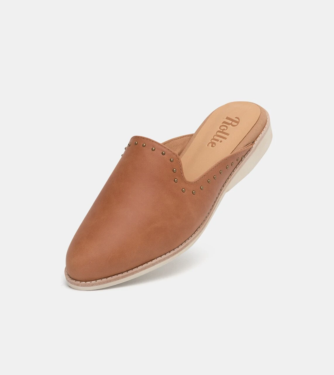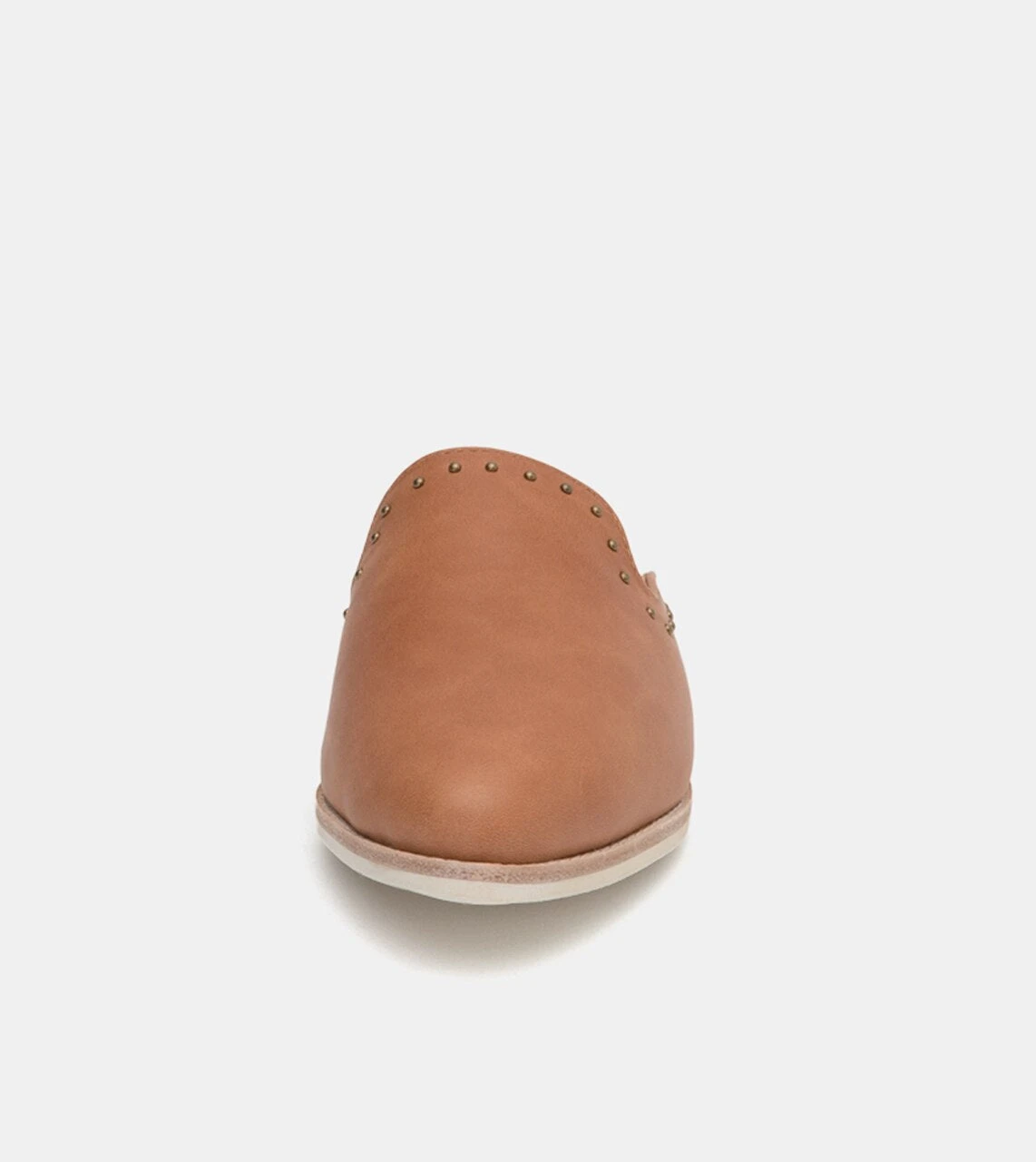 The Madison Mule Cognac Burnish/Gold Studs is a summer staple.
