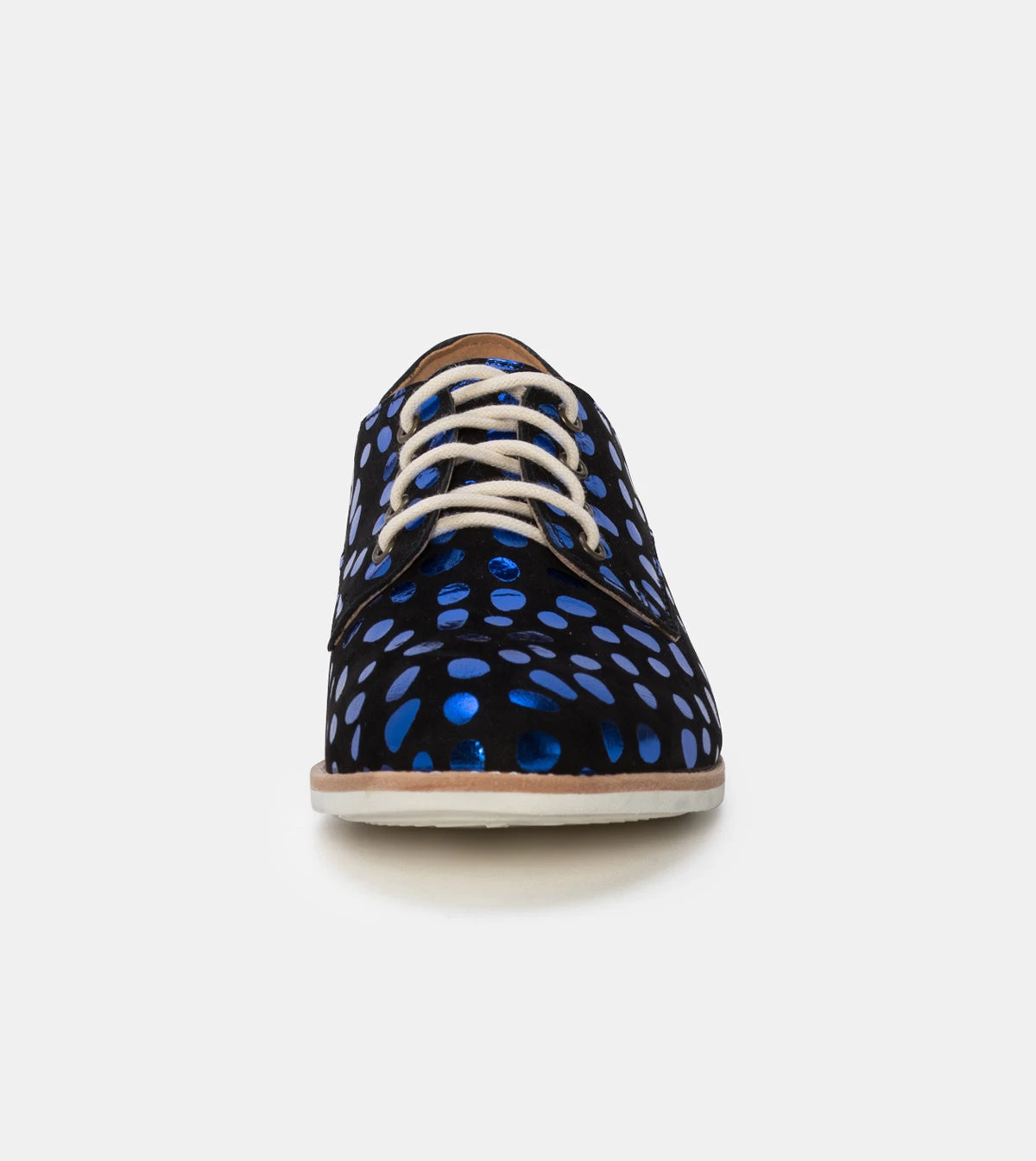 - Soft, black leather upper with blue foil spots that moulds to your foot from first wear