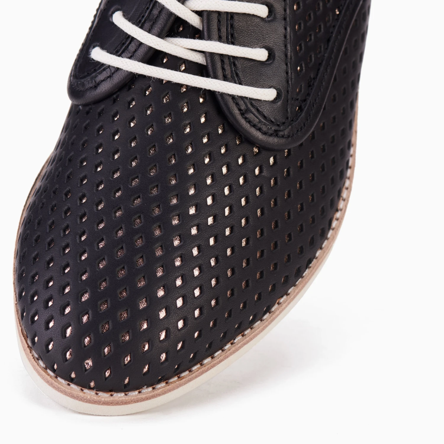 A shoe with a heart of gold. Literally. Black punch leather upper with shimmering gold underneath, like a just discovered bounty of treasure. Luxurious leather and canvas lining and memory foam socks for soft touch comfort. Versatile enough for work or play. Who says black shoes have to be plain? Make any outfit sparkle (oh, there we go being literal again).