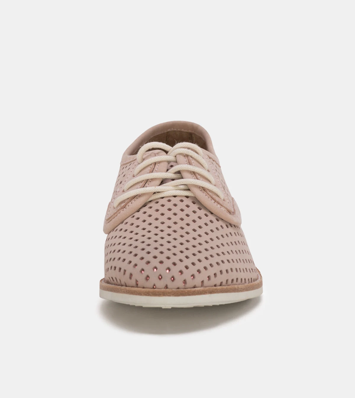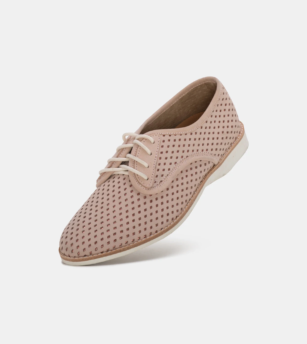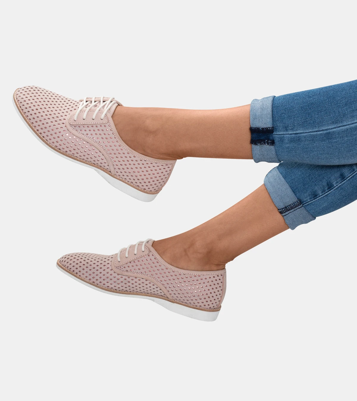 A shoe with a heart of gold. Literally. Punch leather upper with shimmering metallic pink underneath, like a just discovered bounty of treasure. Luxurious leather and canvas lining and memory foam socks for soft touch comfort. Versatile enough for work or play. Make any outfit sparkle (oh, there we go being literal again).