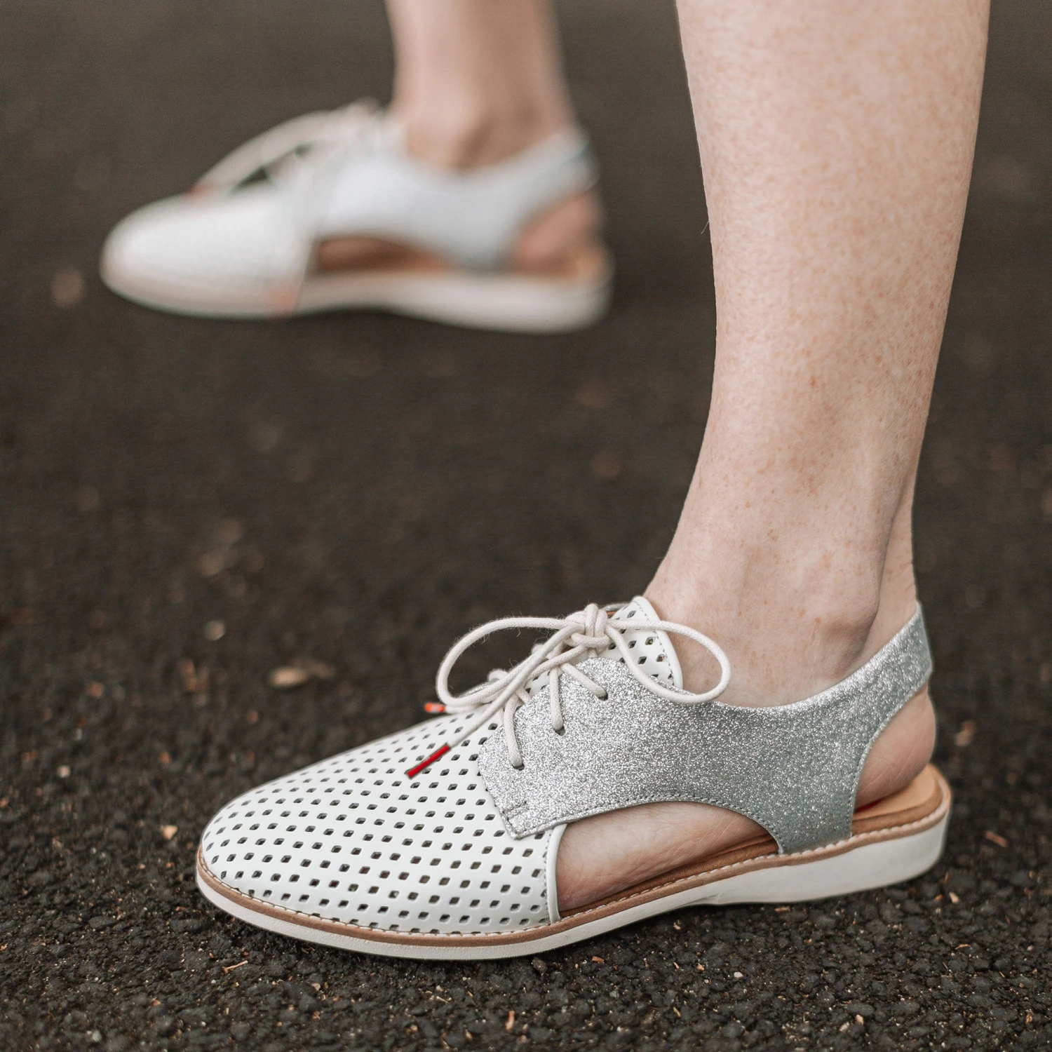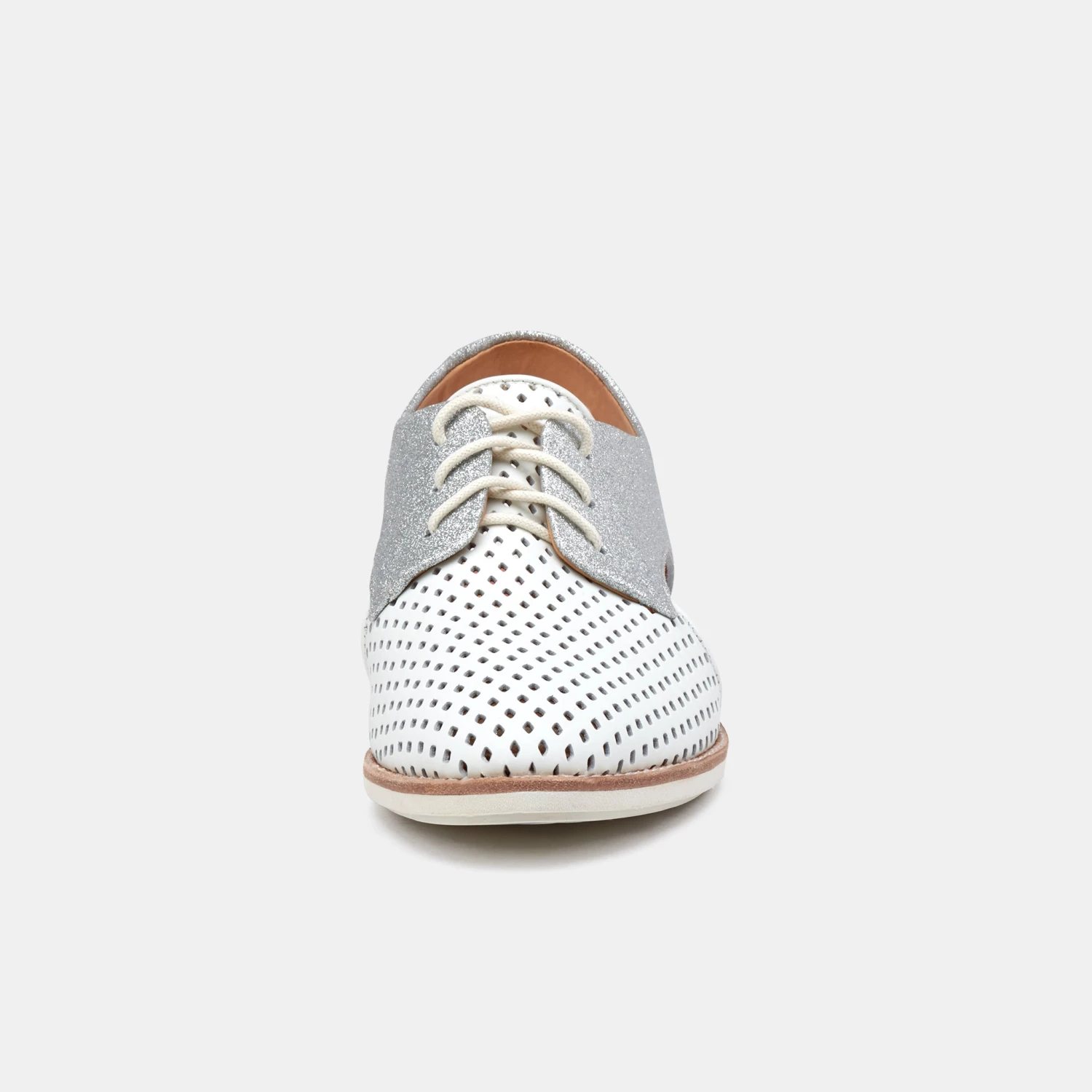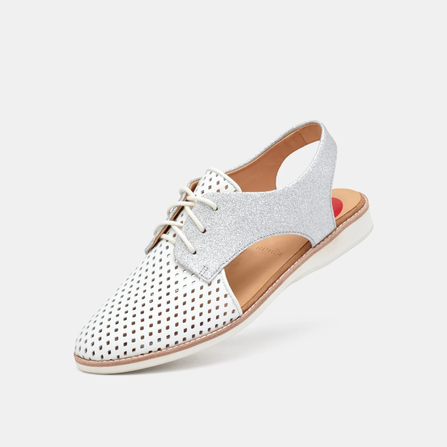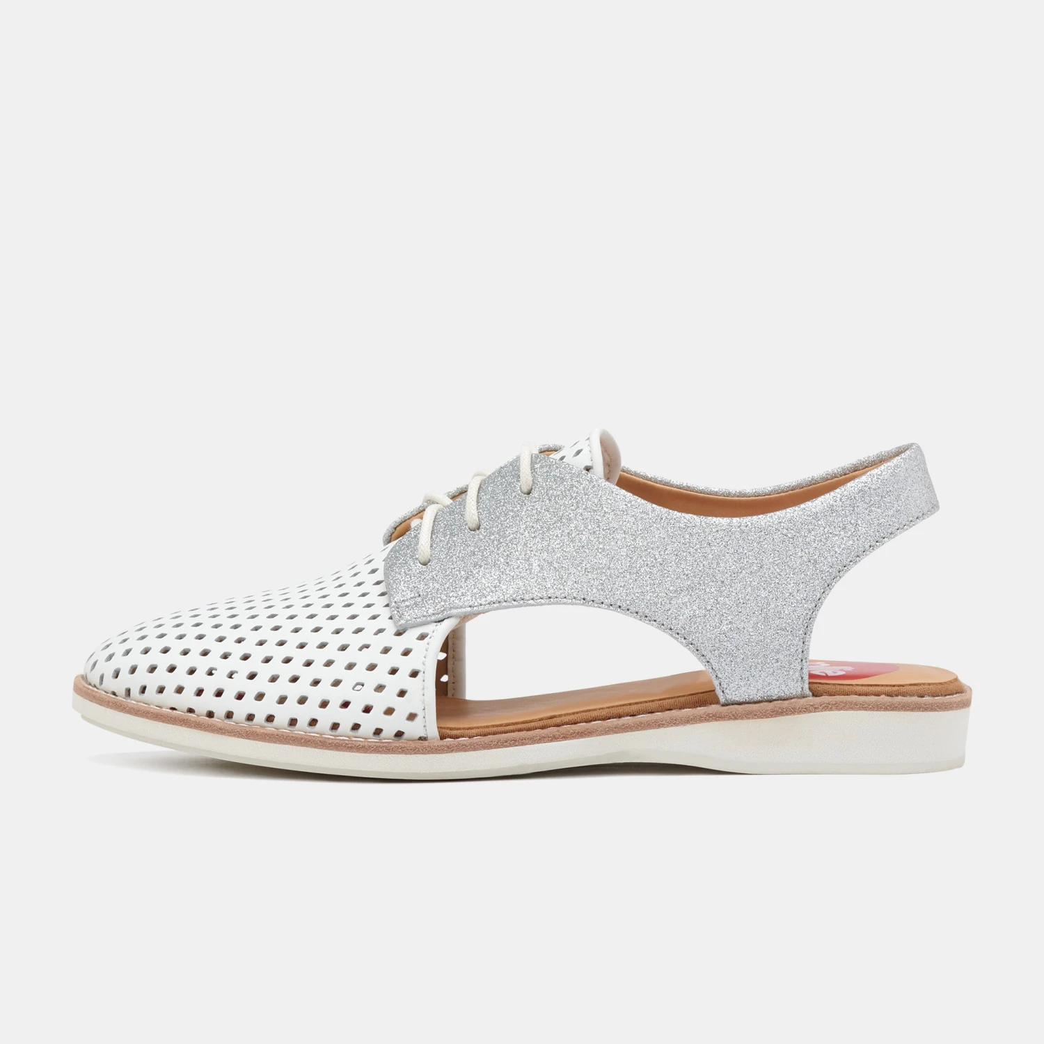 - Soft white and silver glitter leather upper that moulds to your foot from first wear